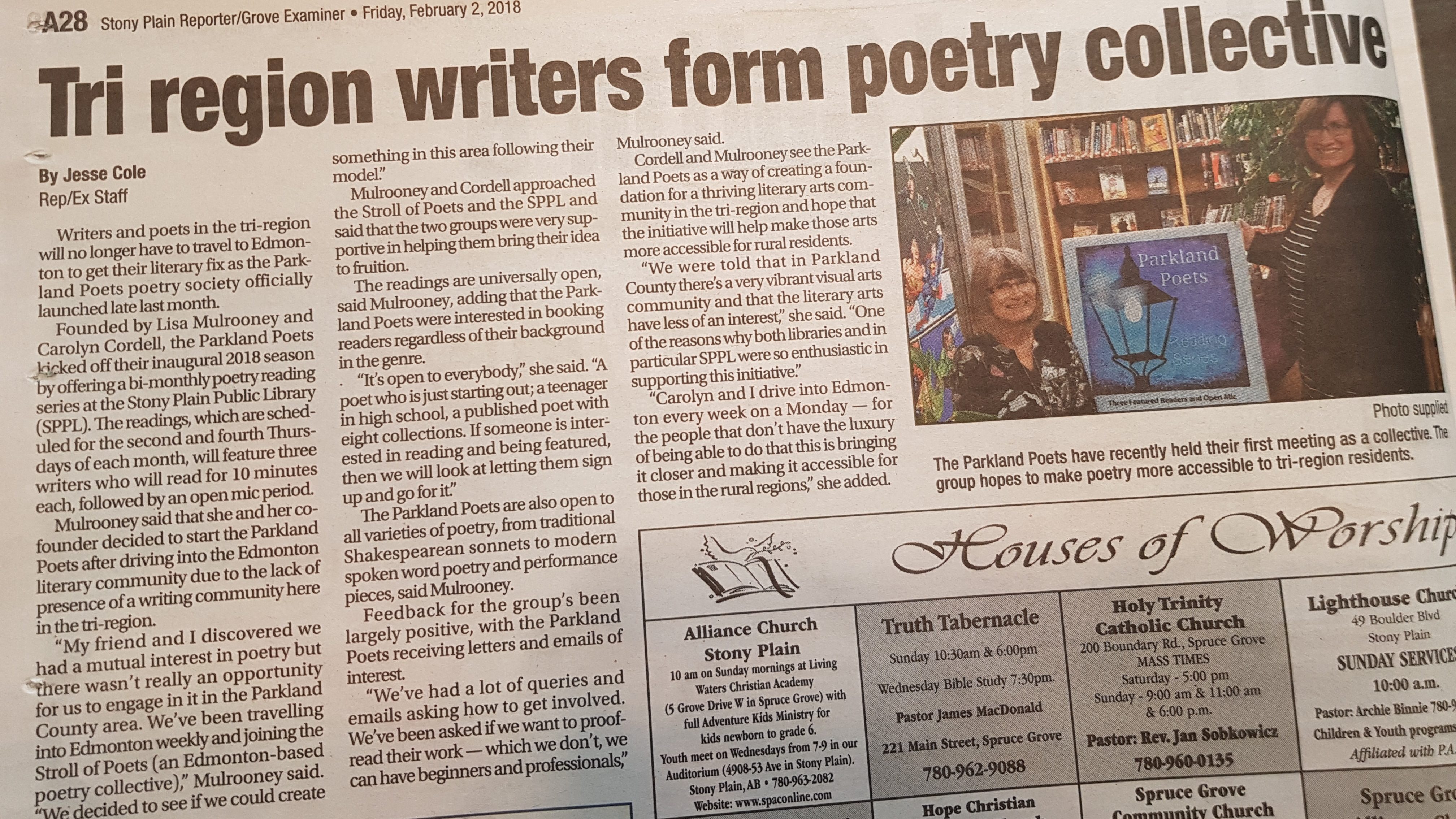 The Parkland Poets’ Society was founded in January 2018 in Stony Plain, Alberta. The very first reading happened at the Stony Plain Public Library during an Albertan snowstorm, but 15 poets and poetry enthusiasts braved the snow and ice to see what a poetry reading was all about.